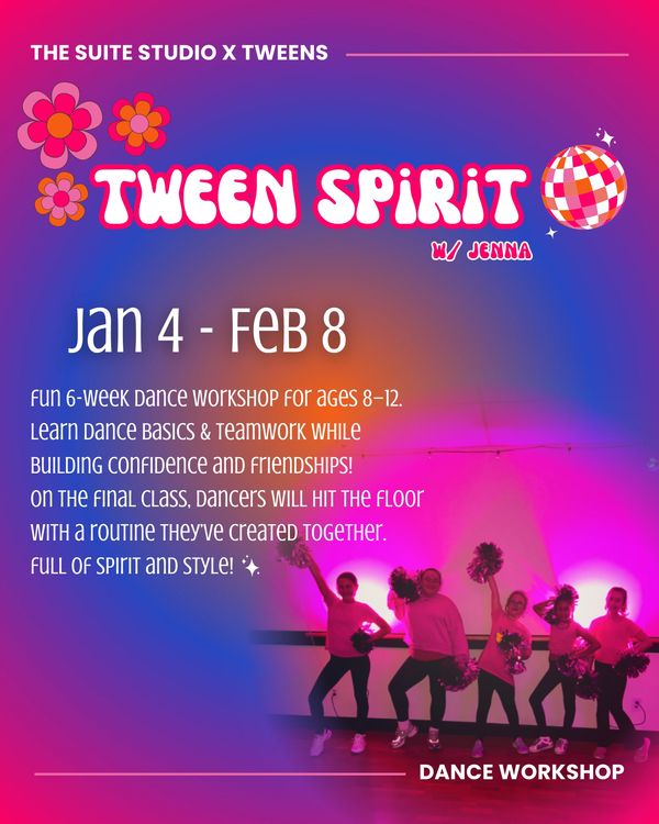 Calling all 8–12 year olds ready to move, groove, and sparkle! Tween Spirit is a 6-week dance workshop where fun meets fundamentals. In this upbeat class, dancers will learn the basics of dance, teamwork, and performance, all while building confidence and friendships.